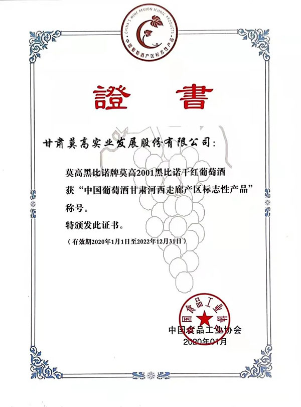 莫高2001黑比诺荣获 “中国葡萄酒甘肃河西走廊产区标志性产品”称号